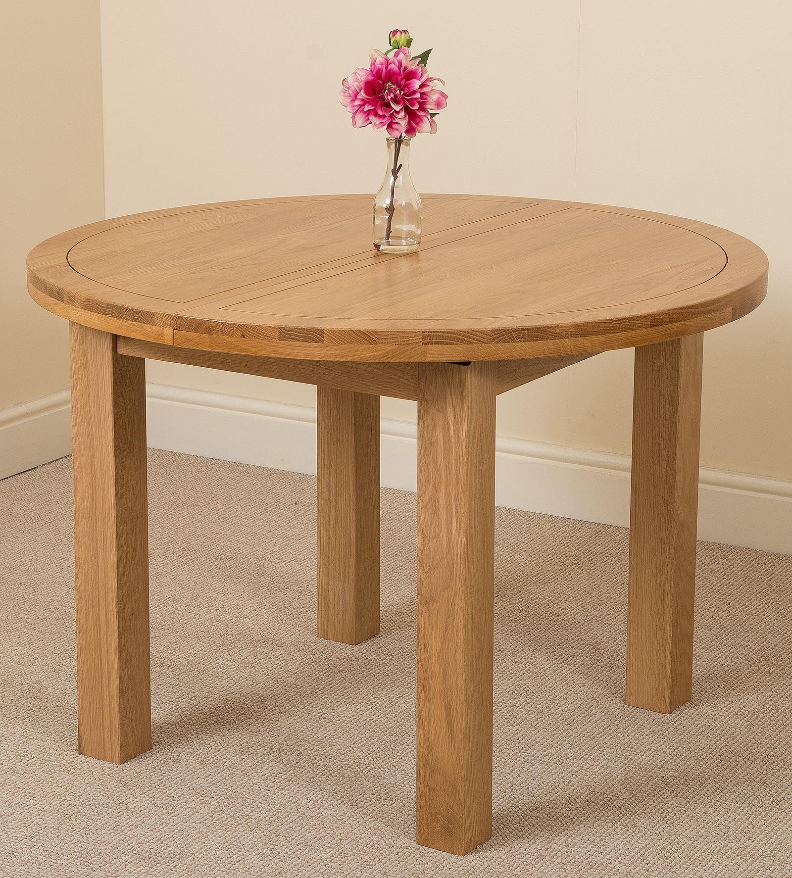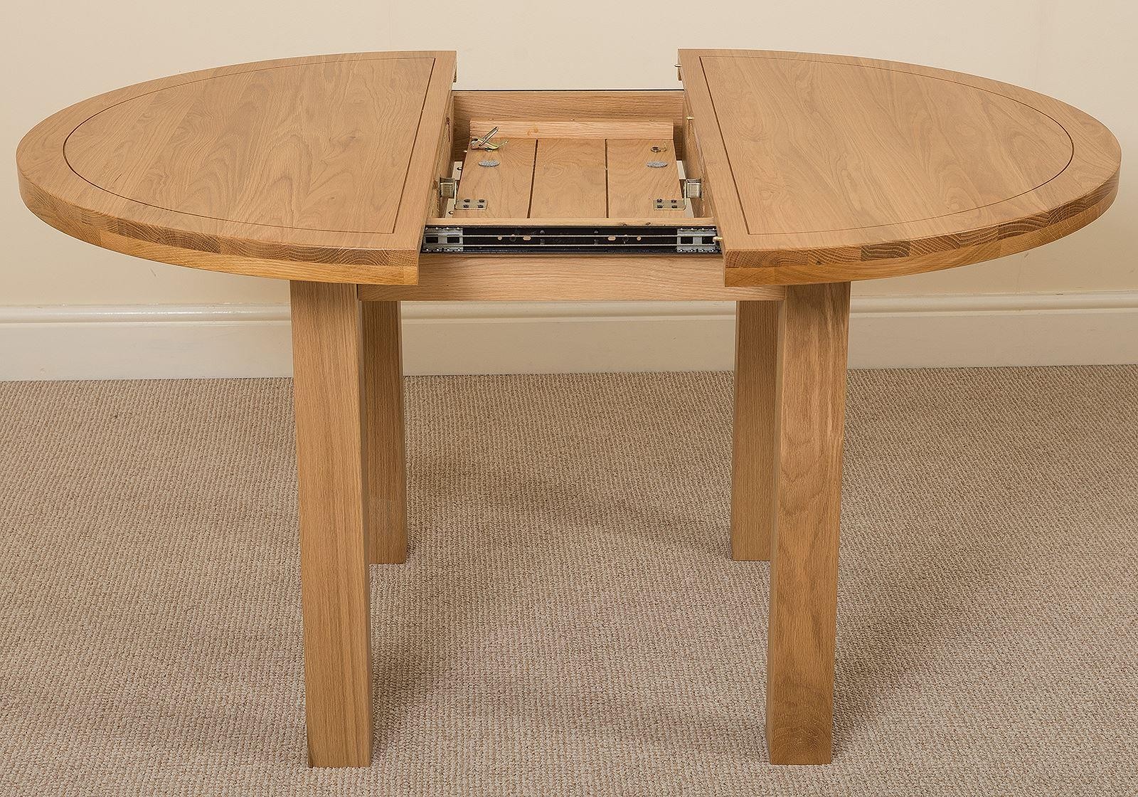 The Round Edmonton dining table is designed for smaller compact spaces and is perfect for the occasional additional meal time guests. The table is made entirely from 100% solid oak wood and features an easy to use butterfly extension mechanism where the table slides open and the extension panel flips out and slots into the centre of the table. Once in, the table pushes back together to fit flush against the side panels. There are locks underneath the table to prevent the extension coming loose.