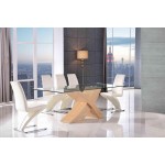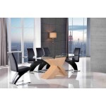 The Valencia Modern Glass dining table and Chair Set is a stunning combination of glass and wood with its feature piece ‘X’ design base and 12mm thick glass top. The clear glass top creates a sense of space in addition to revealing the full beauty of the chunky ‘X’ shaped frame, whilst the natural wood effect adds a touch of warmth and cosiness to the overall look. The Valencia dining table is available in 2 sizes, 160cm x 90cm (small) and 200cm x 100cm (large). The small table can comfortably seat up to 6 people and the large can seat up to 8. The glass is firmly attached to the base using contemporary stainless steel metal discs which screw into the base. The table also has adjustable feet hidden underneath the base making it possible to adjust the table on uneven floors. Have a look at the Dining Chairs before you choose the dining set so you can have a closer look.
