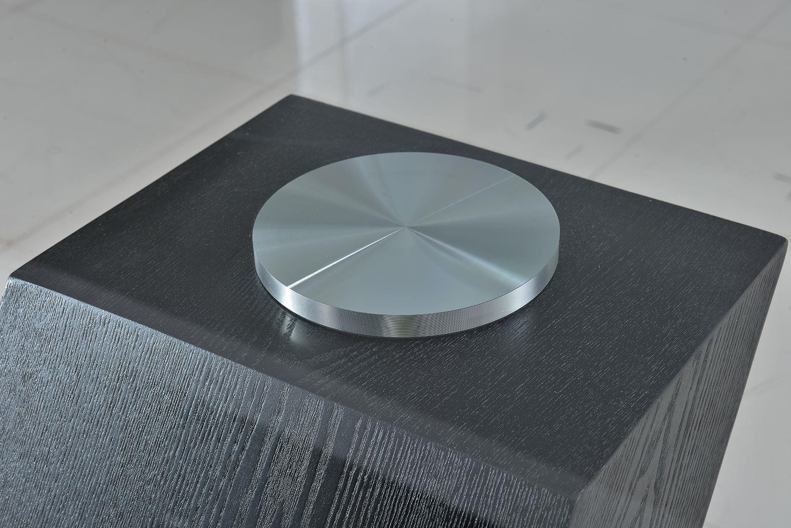 The glass is firmly attached to the base using contemporary stainless steel metal discs which screw into the base. The table also has adjustable feet hidden underneath the base making it possible to adjust the table on uneven floors.