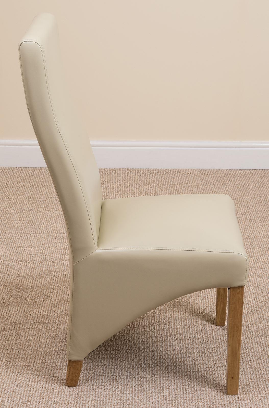 The Valencia is a stylish combination of glass and wood. Contemporary in application, timeless in design. The base is made of wood and finished in an oak colour real wood veneer. The natural wood grain can actually be felt and seen on the base unlike foil or paper veneers. The glass is firmly attached to the base using contemporary stainless steel metal discs which screw into the base. The glass table top is made of 12mm thick tempered safety glass. The table has adjustable feet hidden underneath the base making it possible to adjust the table on uneven floors. 12mm thick glass top tempered glass used for safety and extra strength. Apart from the improved strength tempered glass dramatically reduces the risk of personal injury in the very rare instance of breakage. All edges are polished and beveled for a perfect finish and added assurance of safety combined with the gorgeous Lola high back dining chairs, this set will add a touch of style and class to any dining area. Upholstered in supple bonded leather, the curved back Lola chairs have chunky solid oak legs with padded backrest and seat. The seats are fully sprung which provide a comfortable bounce and help maintain the comfort and shape of the seat. Every chair comes fully assembled and ready for use. All of our chairs are made to strict British Standards and come with a full 12 month warranty. The Lola chairs are also available in ivory, black or brown.
