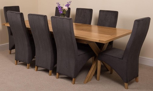 Vermont Solid Oak 200cm-240cm Crossed Leg Extending Dining Table with 8 Lola Dining Chairs [Black Fabric]
